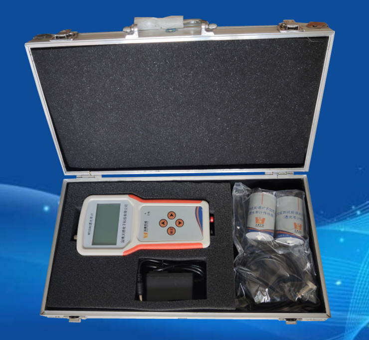 2)測(cè)試: 依提示 “加玻璃,對(duì)齊白貼”在兩筒間加被測(cè)玻璃,測(cè)試時(shí)兩筒橫截面重合,對(duì)齊白線,按“確定”鍵,屏幕顯示:“透光率: XX.X%”。